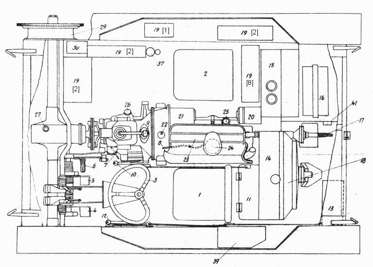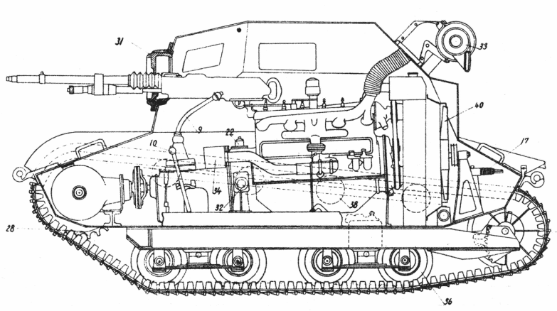 1 - driver's seat, 2 - gunner's seat, 3 - driving wheel, 4 - clutch pedal, 5 - brake pedal, 6 - acceleration pedal, 7 - acceleration lever, 8 - ignition regulation lever, 9 - gear change lever, 10 - lever opening hatch nr. 11, 11 - air inlet floor hatch, 12 - lever opening hatch nr.13, 13 - air outlet rear hatch, 14 - water radiator, 15 - fuel tank, 16 - battery, 17 - engine starter shaft, 18 - fan cover, 19 - ammunition cases (in brackets number of cases), 20 - dynamo, 21 - starter, 22 - starter button, 23 - engine cover, 24 - ignition apparatus, 25 - engine oil inlet and venting chimney, 26 - gearbox oil cork, 27 - differential oil cork, 28 - drive sprocket, 29 - brake drum, 30 - case for explosives, 31 - MG mounting, 32 - suspension mounting, 33 - muffler, 34 - air cleaner, 35 - idler wheel, 36 - road wheel, 37 - track, 38 - return roller, 39 - tool box, 40 - fan, 41 - box for fuses. |