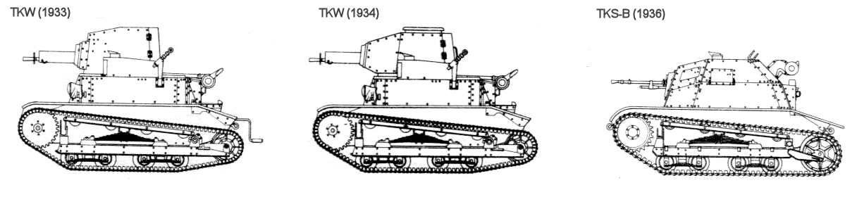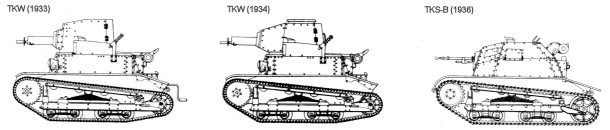 This article is a supplement to the Polish tankettes TK-3 (TK) and TKS, presenting their experimental variants TKW and TKS-B. Experimental self-propelled guns TKD and TKS-D are described on a separate page, so is an auxiliary equipment for tankettes, excluded from this page.