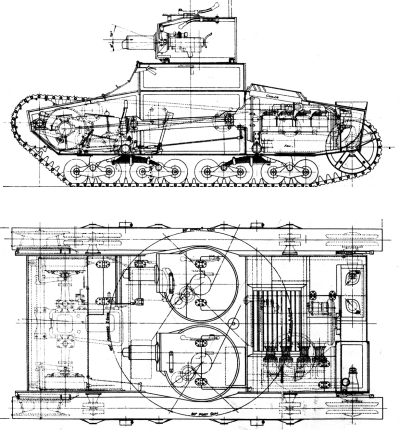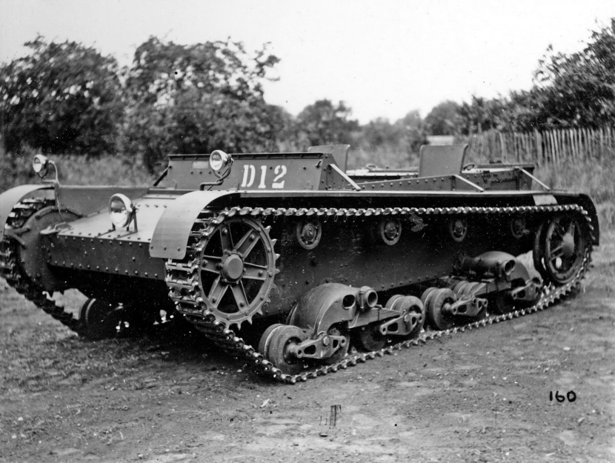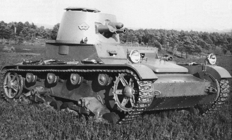 A prototype of the Vickers-Armstrongs 6-Ton (Mark E) light tank was constructed in 1928 in the British Vickers-Armstrongs Ltd factory, as a private venture. Among its designers were famous John Carden and Vivian Loyd. The tank was designed in two variants: a twin-turret Type A (Alternative A), armed with two machine guns, and a single-turret Type B (Alternative B). The novelty in the world was, that Type B tank was armed with a cannon and a co-axial machine gun in the turret (called a "duplex mounting" at that time). Earlier tanks and armoured cars were either armed with only one weapon, like Renault FT family, or with two weapons placed in separate mountings (and sometimes different sides of a turret), which could not be manned by one man at a time. Some tanks also had machine guns in hull sides, which were of little use, but demanded big hull volume and additional crewmen. The duplex mounting, which now seems obvious arrangement, allowed instant change between a cannon or a machine gun fire, depending on a target engaged. Both weapons had common sights and a trunnion axis and could be elevated and traversed together. According to Vickers sales brochures, with the duplex mounting, fire can be opened with Armour Piercing or High Explosive shell from the quick firing gun against the tank or machine gun emplacement, and can be followed immediately by fire from the machine gun without a necessity for relaying. Also thanks to a two-men turret, the commander was not overloaded with tasks, unlike in French tanks from 1930s. With its short-barrel 47 mm cannon, Mark E Type B tank offered quite good firepower, especially with HE shells, but also adequate to fight all contemporary tanks. Despite its armour showed later as inadequate, at the moment of design it was even better, than of a standard British Vickers Medium Mk II tank. It carried a cannon of the same caliber, shorter, but more universal thanks to HE shells. The Mark E was also smaller and faster, than the Medium tank. Its patented suspension was a new design, consisting of two independent sets of double bogies on each side, fitted with cantilever springs. Each suspension unit pivoted on its own axle. It was quite simple, reliable and offered a relatively smooth ride. Manganese steel small-link tracks had a very good durability of 3000 miles.