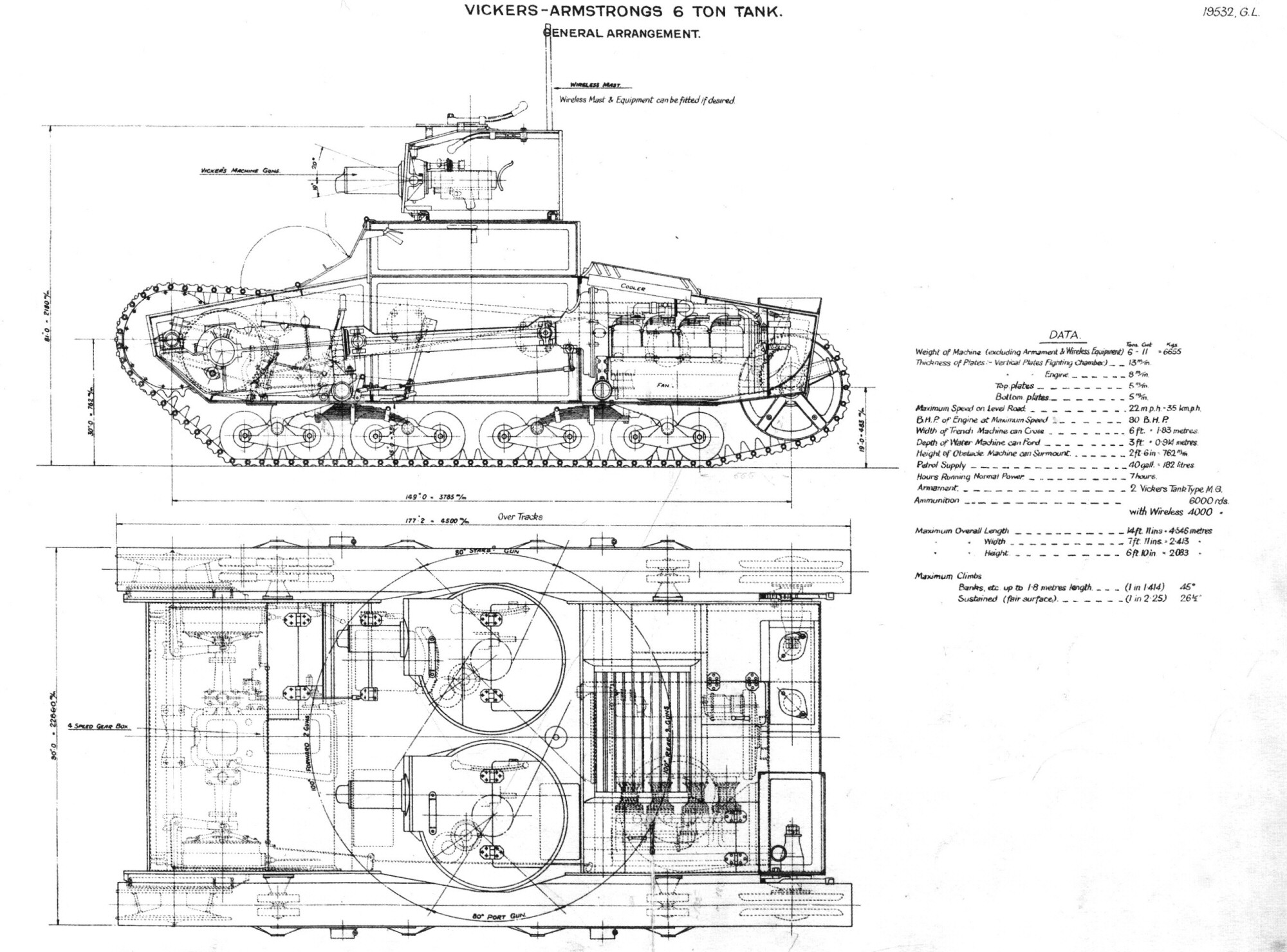Suspension: 23-tooth drive wheels were at the front, adjustable idler wheels at the rear. The distinctive patented Vickers paired bogie-type suspension consisted of eight double wheels on each side, paired in two-wheel bogies. Two bogies formed one common unit, sprung with a pair of flat springs. Each suspension unit pivoted on its own axle. Twin road wheels, 305 mm in diameter, were steel with rubber rims, except for last wheels, which were all-steel and rimless (apart from the earliest tanks). One track had 108 links (there is also an information about 102-103 links)[note 4]) Track width was 230 mm, pitch: 92 mm. There is an information, that some series had tracks 260 mm wide, and at least in the case of Finnish tanks they were widened to 290 mm. Track ground length was 270 cm, track center spacing: 204 cm. Four return rollers on each side.