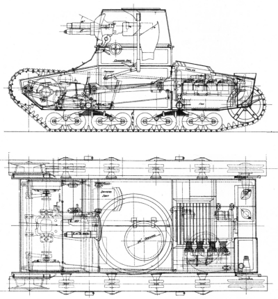 Engine: Armstrong-Siddeley carburettor engine, located at the rear of the fuselage in a low engine compartment (in publications the model is often called "Puma", but it is not known if such name was actually applied). The engine was four-stroke, four-cylinder, in-line, overhead valve, horizontal, air-cooled. Displacement was 6667 cm³[1] or according to other sources, 6600 cm³[7]. The cylinder diameter was 120 mm, the piston stroke was 146.5 mm. The engine developed a nominal power 80 hp at 2000 rpm, and a maximum power 82 hp at 2100 rpm. One Polish document claims a power output 92 hp at 2000 rpm, which seems to be a mistake. The compression ratio was 4.8:1. The engine was fitted with a double-barrel Clodel-Hobson H.48A carburettor. The weight of the engine was 545 kg. Two fuel tanks on the right side of the engine compartment had a capacity of 182 liters. The engine was mounted longitudinally, in the center of the fuselage, with the cylinders facing left and the clutch at the front. Cooling air entered through a rectangular opening above the engine in the center of the top plate, with adjustable louvers. The air was drawn in by a fan located under the engine, then exhausted through an opening on the left rear side of the top plate, often shielded by a sheet metal hood directing it to the rear. There was also an oil cooler directly below air intake louvers. In some tanks, the oil cooler was placed in a perforated armored box on the left side behind the combat compartment.