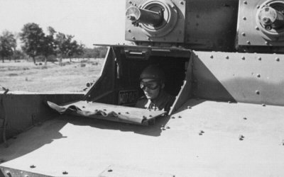 A driver in an open hatch of the Polish Vickers Mark E Type A. Visible is armour thickness and rarely seen dust sealing of the hatch. A Polish license plate of 1937 pattern is carried inside. |