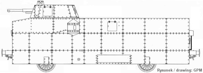 The armoured motor wagon was built upon a chassis of a flatcar series Pddkz, type VIIC. It was fitted with a body of flat plates, screwed or bolted to a frame. Its side silhouette was close to rectangular. Upon a roof, on one end, there was an angular artillery turret made of screwed plates (original description suggests, that this was a front end, though the wagon certainly could ride in both directions with the same speed). The body was first made of wood, to examine a silhouette, but soon it was replaced with a steel one (most probably made of boiler steel, not armour steel, as it was an experimantal unit). A thickness of plates was to be 6-12 mm, which should be enough against rifle bullets from some distance. In cross-section, the wagon was octagonal, its walls were slightly sloped to increase chances of bouncing shots, although apparently not much. Entrances were in front and rear end walls, with two-leaf doors, enabling passing between wagons.