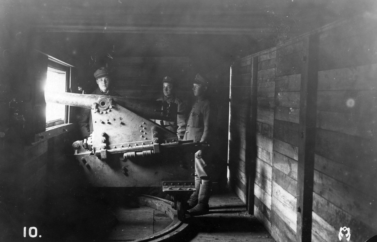 Artillery wagon of Nr. 15 ("Śmierć") armoured train, armed with 100 mm howitzer with atypical angled recuperator cover. |