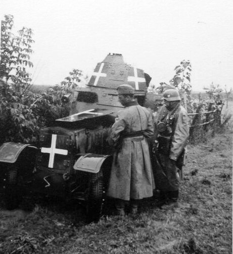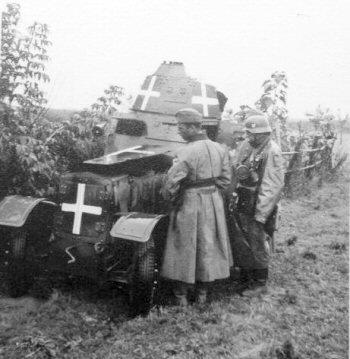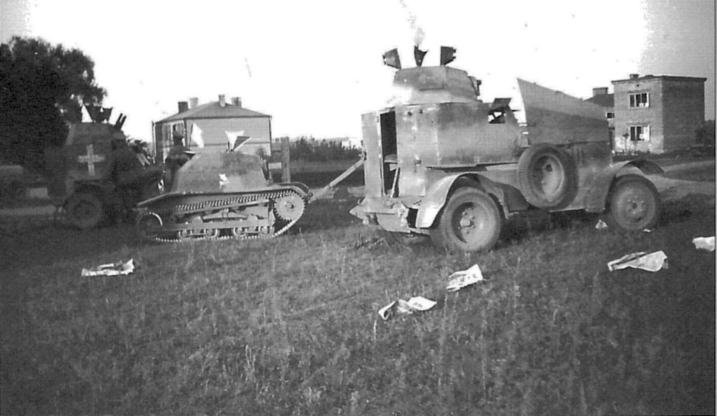 ![]() | Another wz.34 car with an older hull pushed off from a road. German soldier holds a registration plate W05-278 (plates were carried inside only). The car has a triangle signalling flag on a turret. Trees look similar to Zamosc - Tomaszow LubelskiW road... |