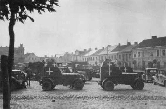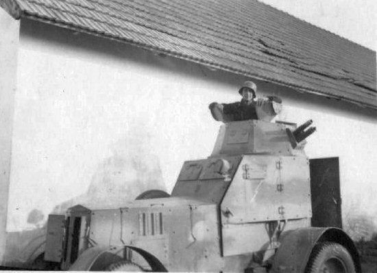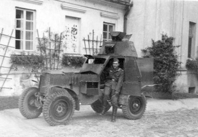 A captured armoured car wz.34 with a newer hull, without a bumper, in a yard in front of a palace in Radzyń PodlaskiW (probably from the 81st Armoured Unit). The car was armed with a machine gun. Note a camouflage pattern. |