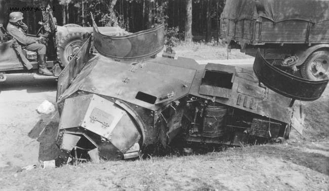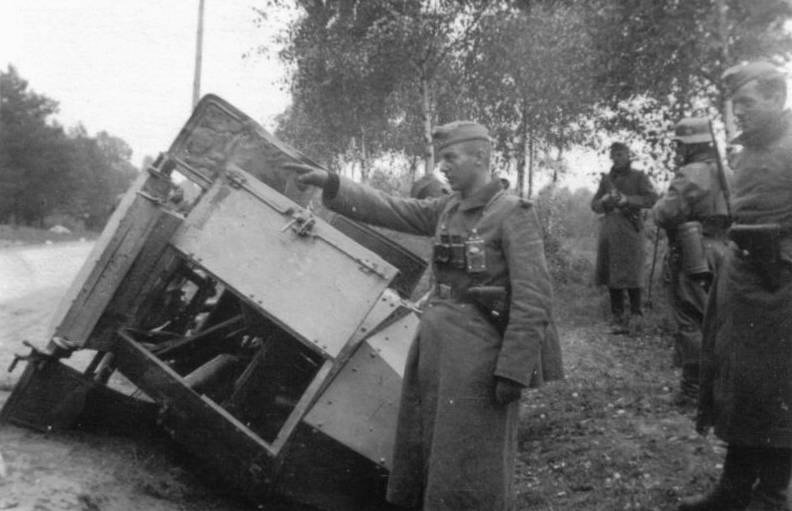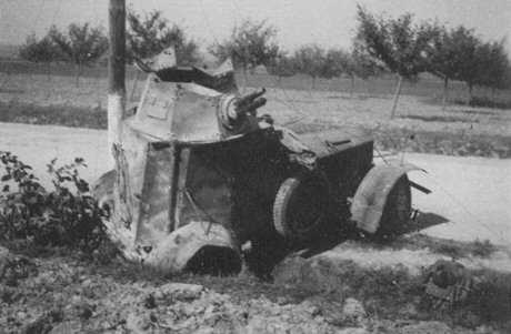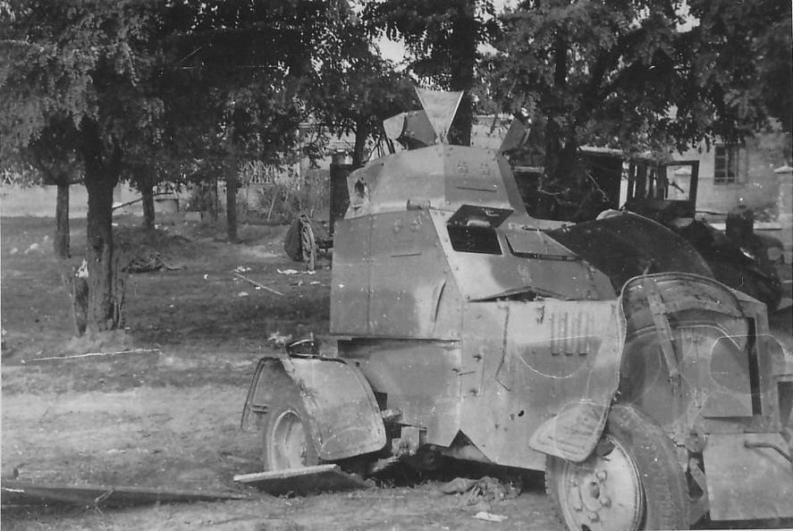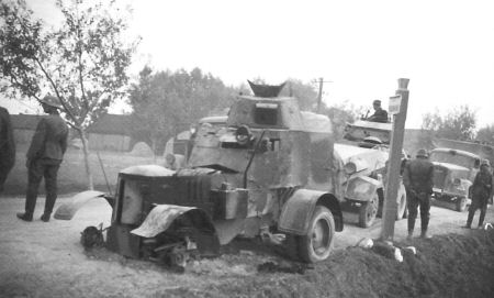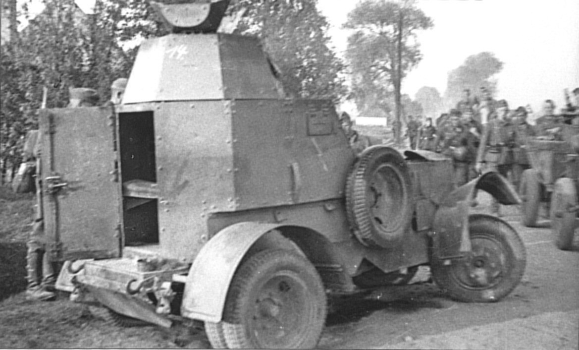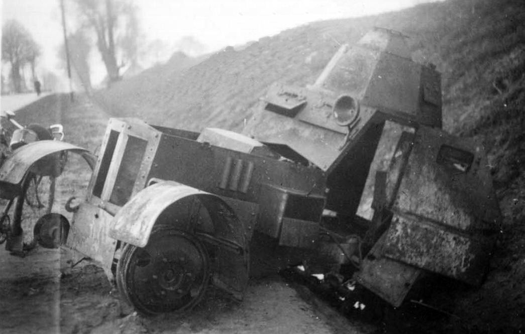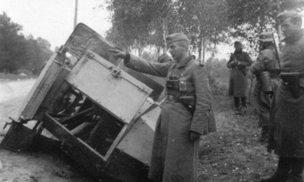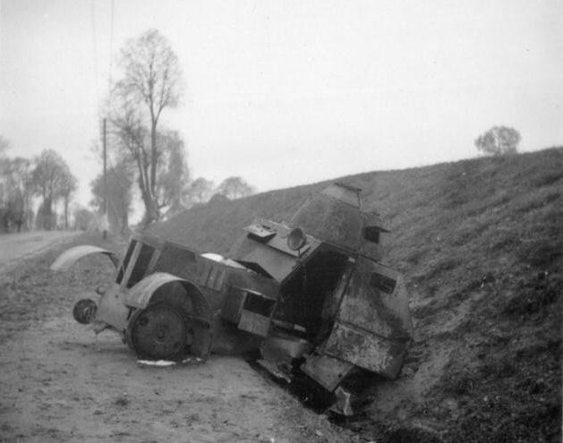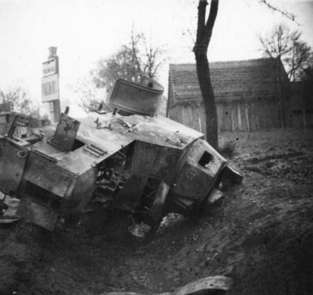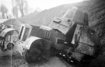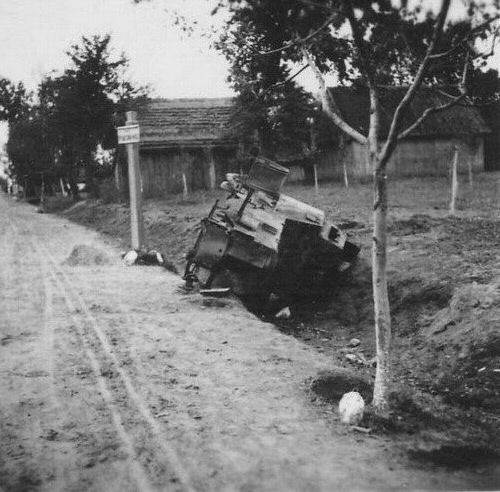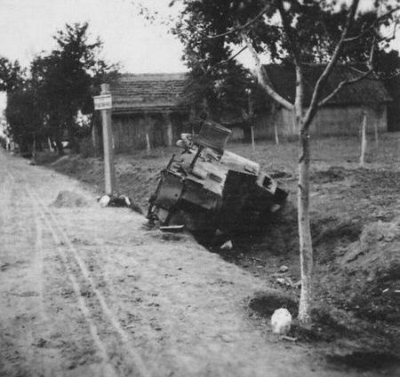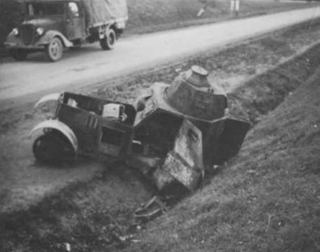 ![]() | Armoured car wz.34 with an older hull, dull nose and a rectangular weapons' mounting. Later it was pushed from a road. One photo was described as Prymusowa WolaW (near OpocznoW), what would suggest the 33rd Armoured Unit. Note, that photos of an overturned car often appear in a wrong mirrored variant. |