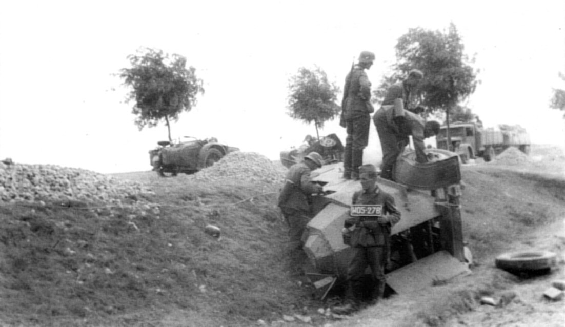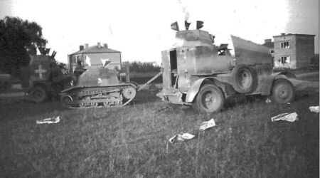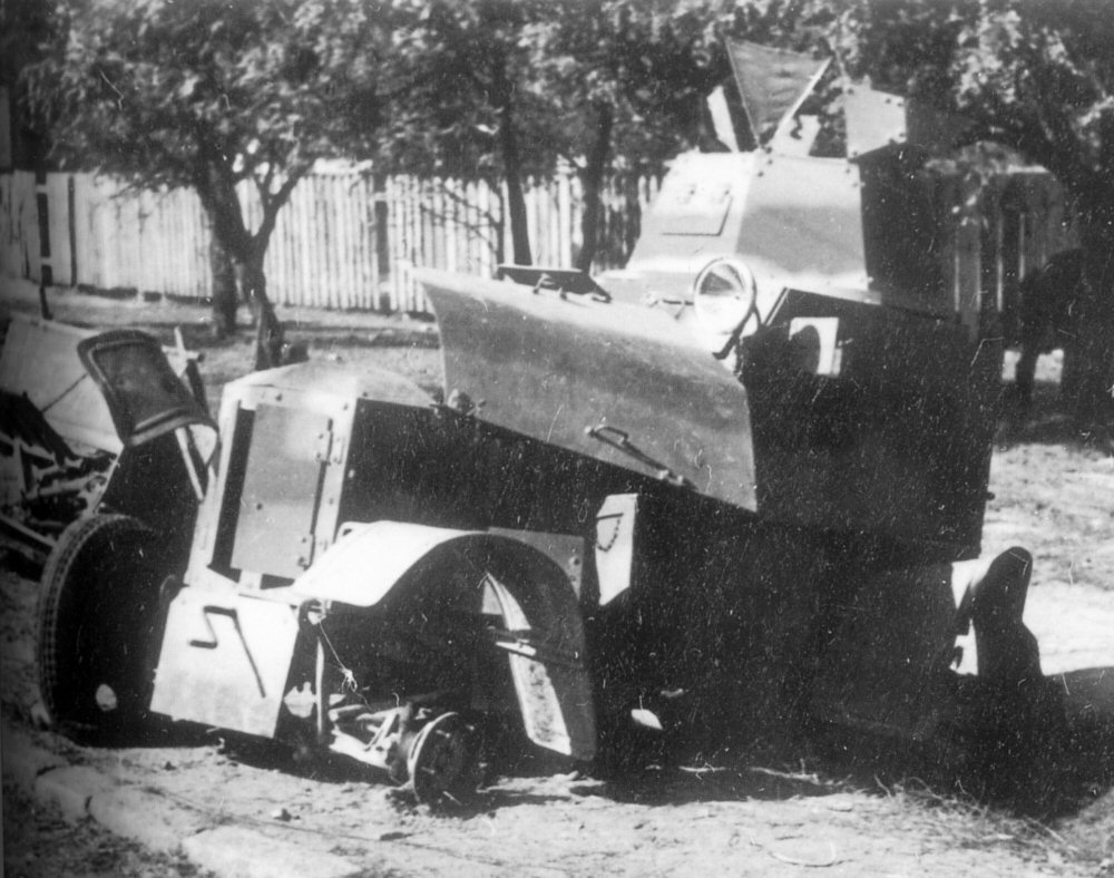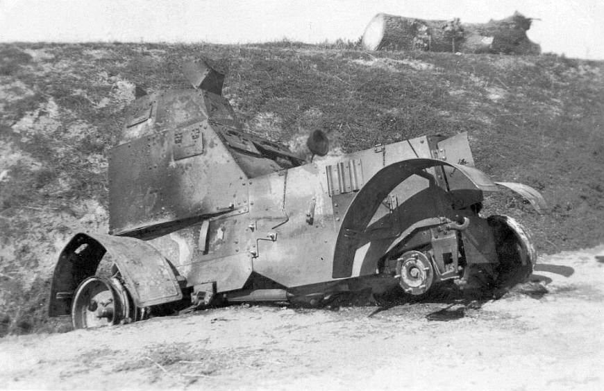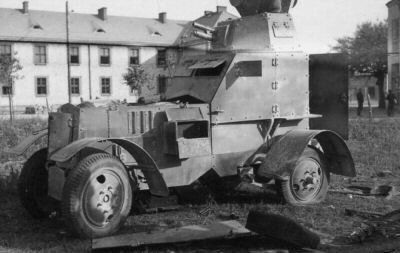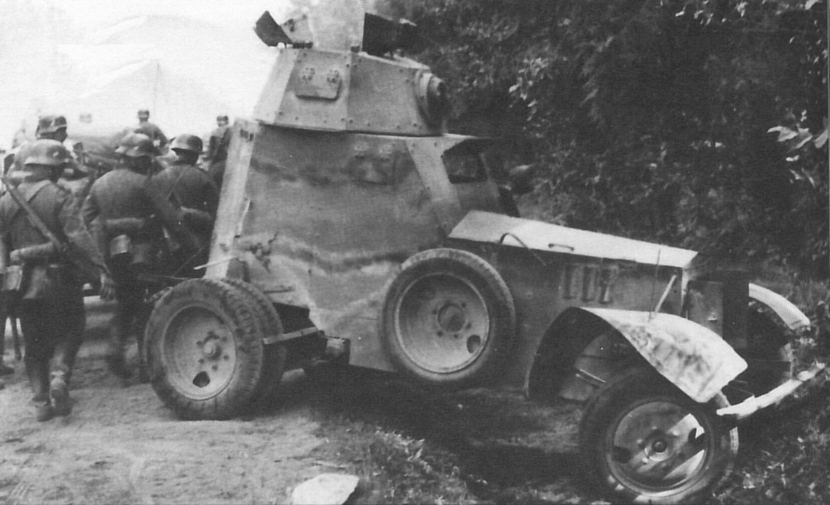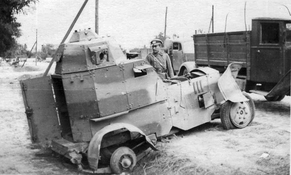 ![]() | Armoured car wz.34 with an older hull, dull nose and a rectangular weapons' mounting. Later it was pushed from a road. One photo was described as Prymusowa WolaW (near OpocznoW), what would suggest the 33rd Armoured Unit. Note, that photos of an overturned car often appear in a wrong mirrored variant. |