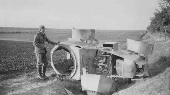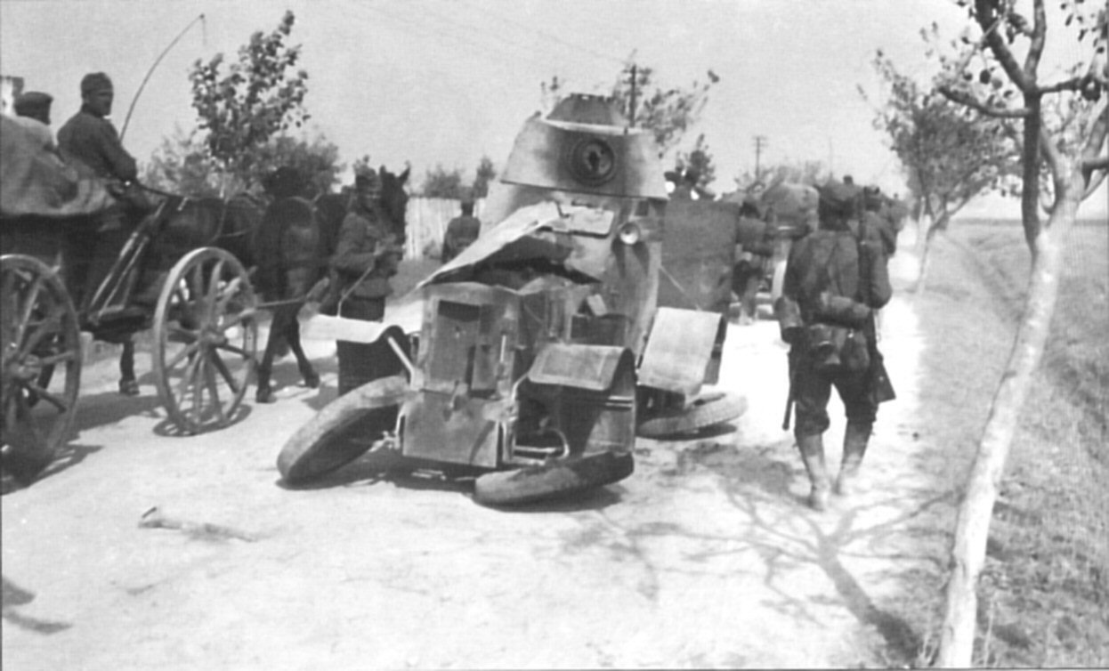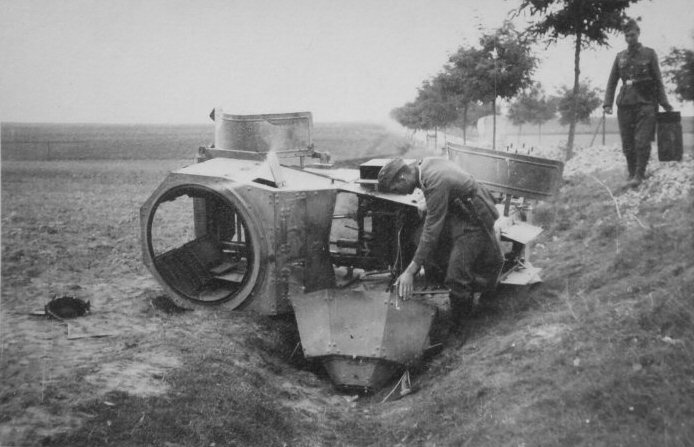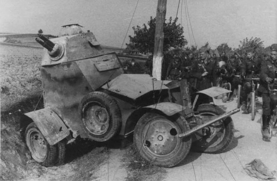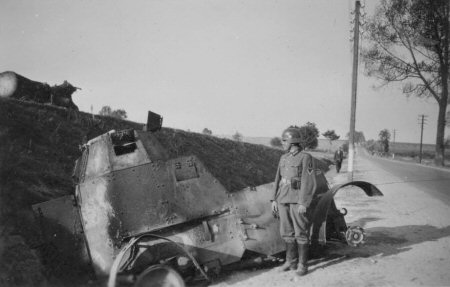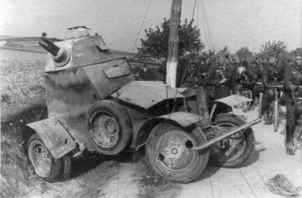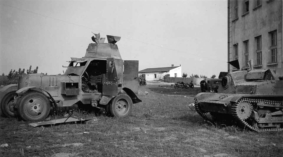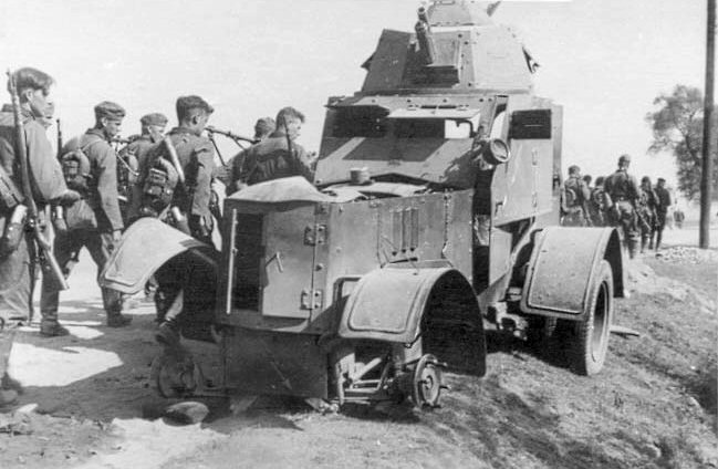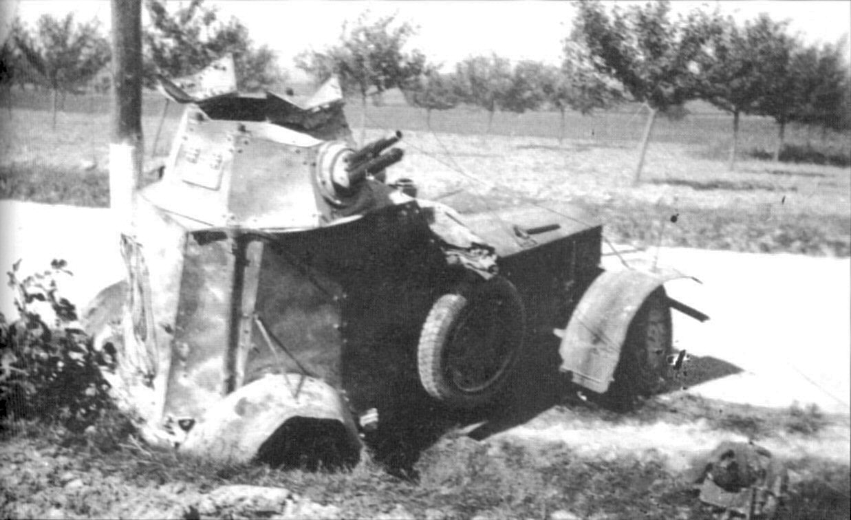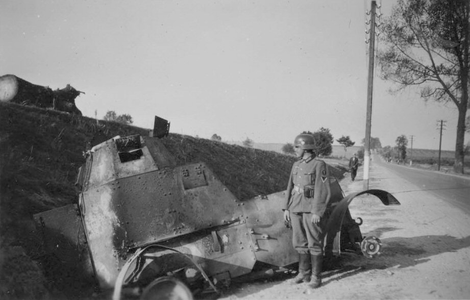 ![]() | Armoured car wz.34 with an older hull, dull nose and a rectangular weapons' mounting. Later it was pushed from a road. One photo was described as Prymusowa WolaW (near OpocznoW), what would suggest the 33rd Armoured Unit. Note, that photos of an overturned car often appear in a wrong mirrored variant. |