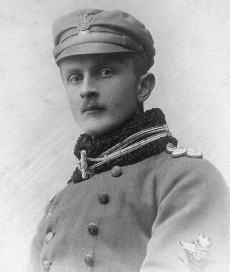 The most known photograph of the "Związek Broni". Before the train, its commander Lt. Stanisław Małagowski (x), on the right his deputy 2nd Lt. Stanisław Biega (xx), and writer Melchior WańkowiczW. Note French helmets, adopted by the Corps as a standard issue from March 1918. |
