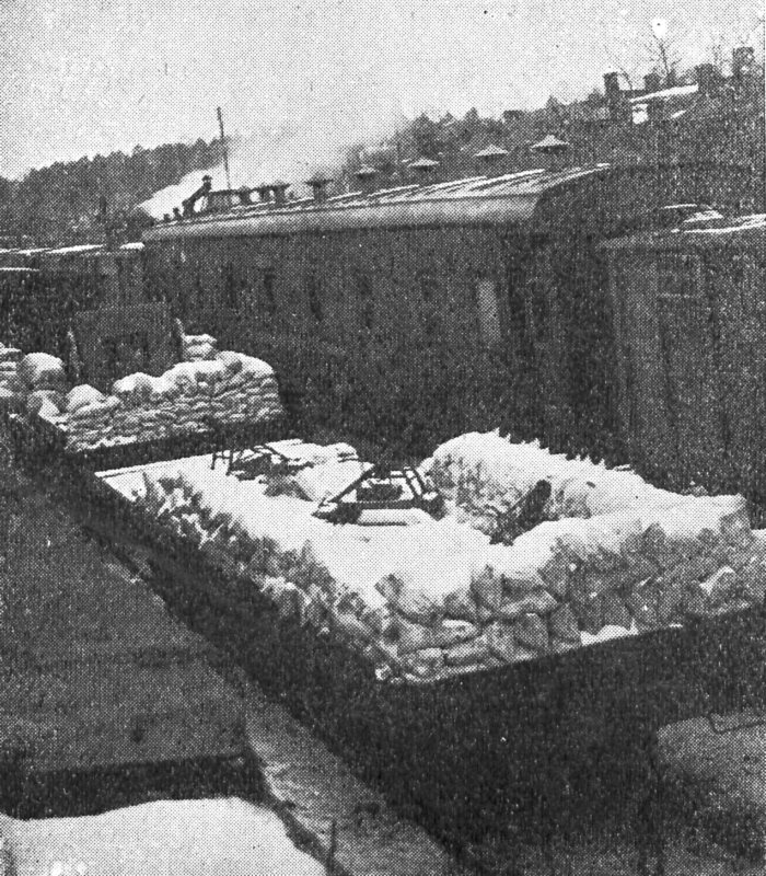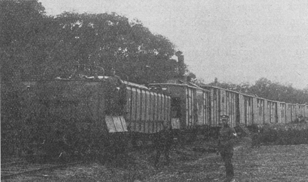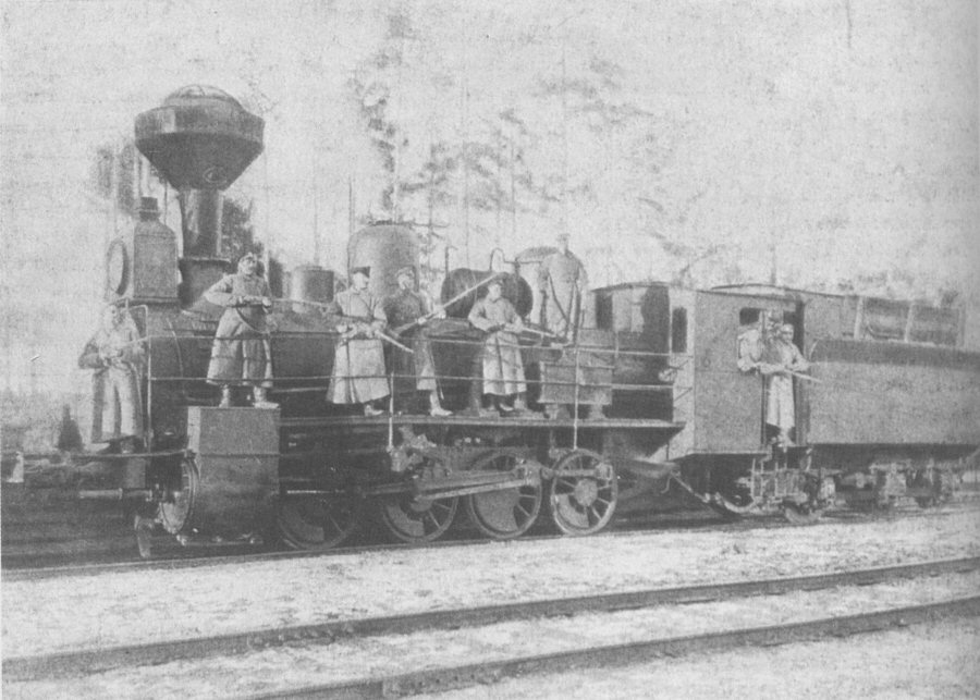 Apart from the cannon, the train was armed with several 7.62 mm Maxim M.1910 machine guns (vague data claims six, but their number could change). Probably they were carried on flatcars, protected with sand bags, or were just shooting from open doors (there are no loopholes in covered wagons visible). The armament was supplemented by the crew's rifles. At first the train also carried eight Russian 9 cm GR mortars on one or two flatcars, but without an ammunition. Probably they were left out after first actions in February.