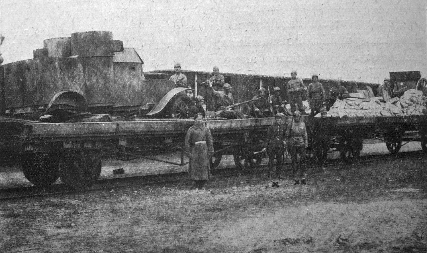 The most significant part of the train was a flatcar with the 1st series Austin armoured car, with damaged rear suspension. It was armed with two 7.62 mm Maxim machine guns in two transversal turrets. It is no clear however, if the car was available in the train from the beginning. There is quite detailed account, that this car was taken over by Lt. Małagowski only on 15 March 1918 in Mogilev, already in damaged condition, and then was "hijacked" with the flatcar, before the Germans could seize it (according to a forced agreement, German authorities were entitled to all military material in Russian towns captured by the Polish Corps)[4]. Other publications claimed in general, that the car was captured in February, with no details[2,5]. It is noteworthy, that such significant train's part was not mentioned in a book about Polish forces in Russia by the 1st Corps officer H. Bagiński, what may mean, that it was not present during its early actions in February. On the photographs from April the car has no machine guns, although it should not be a problem to mount them.