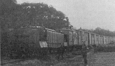 In addition, in Osipovichi, a standard type Russian railway anti-aircraft battery was captured, consisting of at least one four-axle freight wagon of the Fox-Arbel type, armoured in Putilov Works in Petrograd and armed with two 76.2 mm Lender anti-aircraft guns at both ends of an armoured casemate[3] (more on this type in "Generał Konarzewski" armoured train article). An origin of this peculiar wagon is not known (they were used in Russian railway anti-aircraft batteries and in the first Bolshevik armoured train BP No. 2 "Pobeda ili smert" – Victory or death). For unknown reasons it apparently was not included into the "Związek Broni" train, however it canot be excluded, that it was used as a part of some unknown patrol train – what the photograph on the right may suggest. It might have been also used for fortress defence.